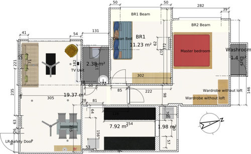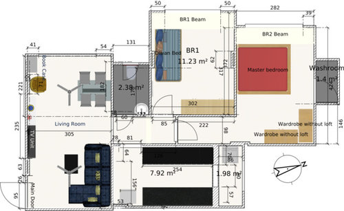Option 1: Sofa in front of door with dining area near window. One drawback is misaligned TV Unit. I tried keeping TV Unit near the entry door, but it looks awkward. Another drawback is that i'm not sure if sitting area could be done in front of door.