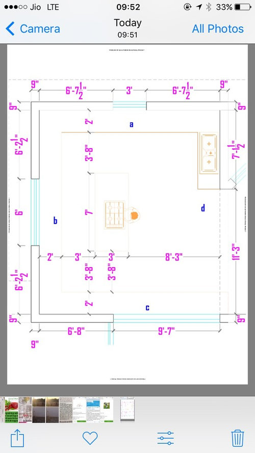 Hi observation says 1. too much window positions not required actually. 2. u will need two basins one for near to cooking area one for preparation counter 3. 6' cooking island is more then enough. 4. No door for wash area??? 5. do go for carpentry work hire kitchen consultant for space designing and get modular one. 6. make check list wht u keep in kitchen wht u store how many people will work at a time. add sitting spaces also.