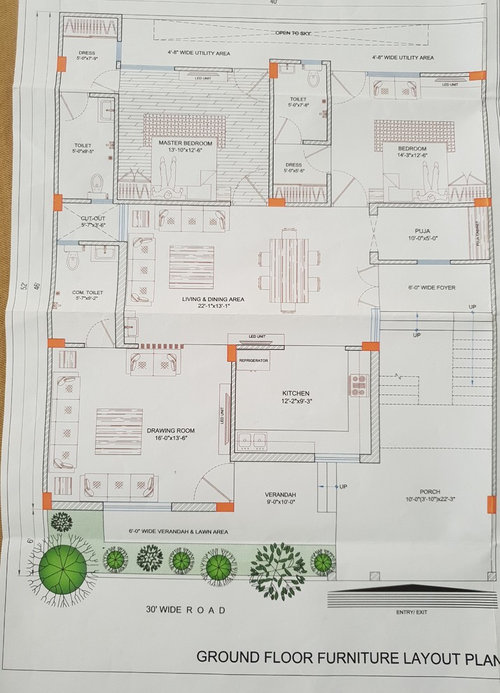 Congrats on getting closer to your dream home. There are a few glitches and the corrected plan is attached. Main problem seems to be lack of natural light to the dining and living; introduction of a courtyard will bring in light and act as a visual link between the kitchen and other living spaces creating interesting viewpoints and play of light. The handwash is now tucked away from plain view; the toilet cutouts can be a glamorous light washed courtyard instead. North direction is not provided but we guess from the front door and gas hob direction that east is towards the porch, so why is the pooja diety made to face west? Arrangement of toilet fixtures is also corrected so that the shower can be curtained/glass partitioned off to avoid spill on to the rest of the dry areas of the toilet. Good luck!
