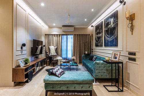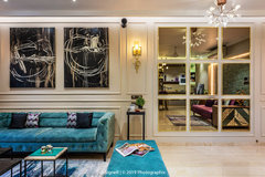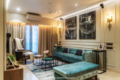The house is adorned with intricate mouldings, suspended ceiling cornices, brass with decorative glass elements and imposing artefacts and accessories. From concept initiation, through design development, detailing, prototyping and guidance in manufacturing - every furniture was customized as per client’s anthropometric requirements. The interior treatment sees meticulous attention to detail and material play.