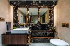 Master bathroom is unusual from the rest of the house. The design was more personalized. Gloss black, Matte white, warm wood and cement grey texture complimented with brass accessories set a perfect example of rich and sophisticated design.