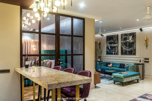 The bar is the most distinctive feature of the entire house. An ingenious play of lights, textures and proportions of the bar unit elevated the design. The bar unit was manufactured and customized as per liquor bottle sizes and different glasses. Instead of a traditional chandelier, we customized an entire new range of globe lights in a series which sets the mood of the space. The concept of dinning was fused with the bar table by striking a perfect design of the table and chairs.