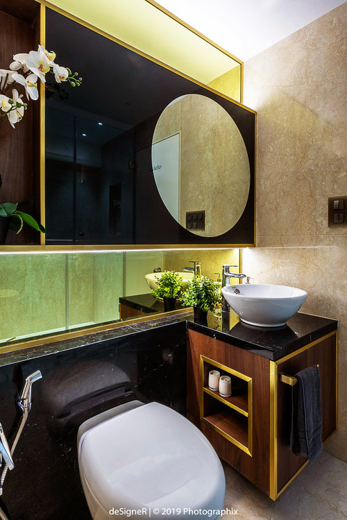 The powder toilet is considered to be the most important part of the design as it is used majorly by anyone who visits the house. A perfect combination of gold mirror, black back painted glass and clear mirror adorned with brass capping create an awe striking basin wall elevation. All sanitary fixtures and accessories of the powder toilet were used from the builder’s inventory which saved cost.