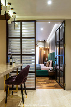 The client initially wanted a visual disconnection between the bedroom and the spill out area which would have cut down on the natural light and ventilation to the central space and kitchen, making it dull. After brainstorming, we proposed a design of a glass partition with a wide door backed with three fold roller blinds –This resolved the purpose of bringing in the natural light and the blinds can be drawn if and when needed for privacy.