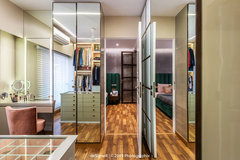 The client wanted a well-organized wardrobe, storage space and dressing table for all her grooming and dressing needs. Team deSigneR broke the conventional design of having wardrobe and dressing space within the bedroom itself and was able to create a secondary space designated for walk in wardrobe, storage wardrobes, dressing table and an elegant display unit of dazzling jewellery and watches in the centre. The bedroom was decluttered, leaving scope for executing innovative designs.