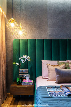 The bedroom took cues from the coral reefs. Balance between the dark and bold hues in contrast with beautiful and luxe textures was the key to achieve this eclectic bedroom design. Peach and light grey subdued the mystical green of the headboard and stone textured charcoal grey backdrop. The wall opposite to the bed is much lighter and has ocean pearl texture.