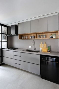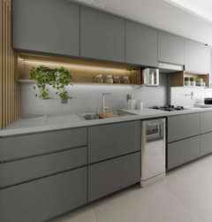 In the name of modular kitchen my carpenter did this (refer to the image posted here). How can I make this look Ok now. Looking for suggestions. How can I feel the gaps where the wall is visible.