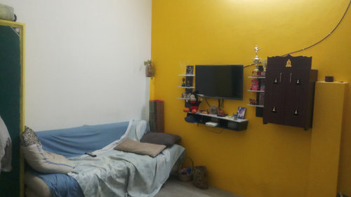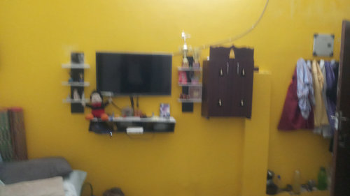 Considering moderate budget - make a use of neutral color paint and furniture. This will make your room size look bigger and rich. I can see a furniture hanging next to your TV, move that to a corner where it won't disturb the appearance of wall. A TV should be ideally mounted at a height of not more than 3 feet 6 inch from the center. An almari can be moved at the existing place of bed without disturbing the sight of your TV as having a bed in front of the door is not considered right (subjective).