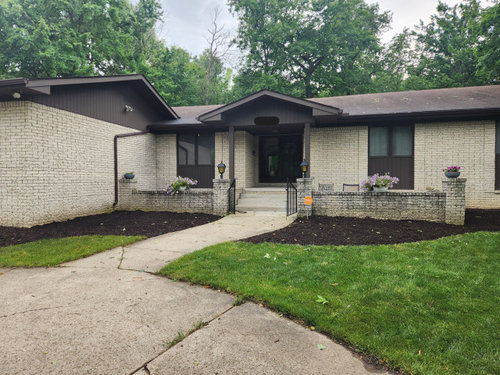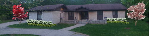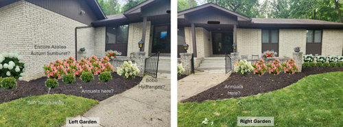 Our current design includes Incrediball hydrangeas with a Soft Touch holly hedge. We'll also have space for annual flowers in front of the hedge on the far left and right sides of the house (outside of the walkway beds).