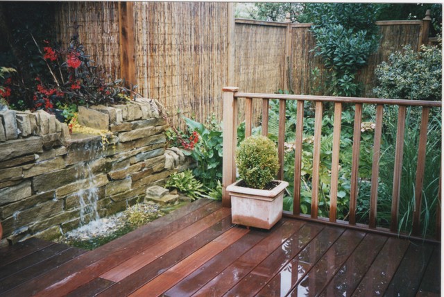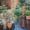 Yorkstone walling, waterfall and IPE hardwood timber deck
