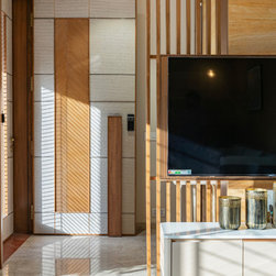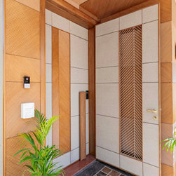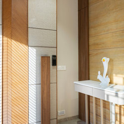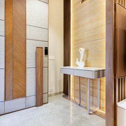 The vestibule is a perfect example of interconnectivity of spaces. It is designed very practically to connect visually with the entry from Kitchen and Drawing Area. The Vestibule is a combination of Relwood and sand stone MCM.