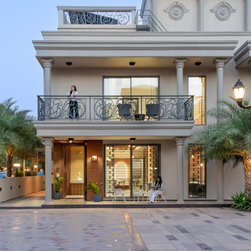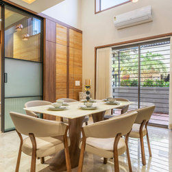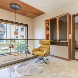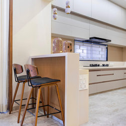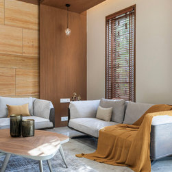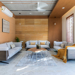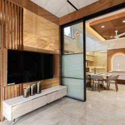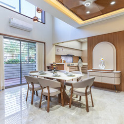 The drawing room in the bungalow is complemented with the feature wall designed by combining Sand Stone MCM and Relwood. To highlight the space, we have used grey mcm in ceiling and grey fabric sofas. Considering the client’s convenience, the kitchen is designed in very minimal way with the use of subtle warm colors. The dining area seamlessly continues the home's refined aesthetic, harmonizing with the subtle and minimalistic kitchen. This space, characterized by its double-height design, incorporates the same color palette and Relwood textures as matched to the living room, creating a cohesive and elegant flow throughout the home. The use of these materials ensures a unified look, while the double-height space adds a sense of openness and grandeur, enhancing the dining experience with a touch of sophistication and continuity in design.