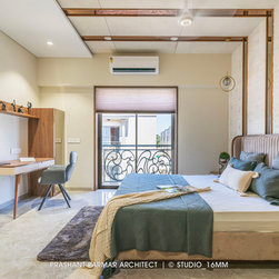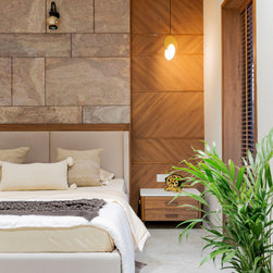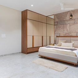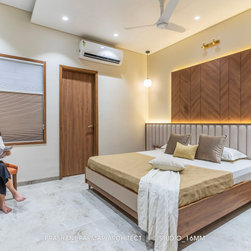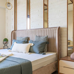 The Parent’s Bedroom on the ground floor features a combination of brown laminate in criss cross pattern, & beige colored leather finish fluted headboard. This creates a minimal yet pleasing ambience in the room.