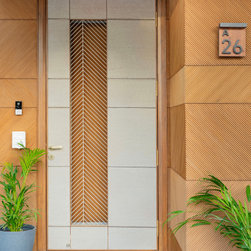 The main door & grill door is decorated with CNC cutwork grill, criss cross pattern MCM & Relwood fluted panels creating a welcoming entry in the bungalow. This amalgamation creates a luxurious ambiance, captivating visitors with a sense of lavishness. This entrance of the bungalow showcases a stunning fusion of design elements, with the main and grill doors featuring beautifully crafted CNC cutwork. The criss-cross pattern lends a contemporary flair, while the incorporation of MCM and Relwood fluted panels adds a touch of timeless elegance. This sophisticated blend creates a visually striking gateway that exudes both charm and grandeur, setting the stage for an inviting and upscale experience as visitors step into the home.