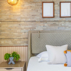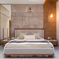 On the first floor, the master bedroom has dark grey stone veneer contrasted with criss cross patterned laminate giving a stylish look to the master bedroom. The stylish mustard yellow recliner chair creates a cozy corner within the room.
