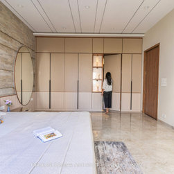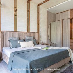 The multipurpose hall and the other daughter’s bedroom is present on the second floor. The daughter’s bedroom has the use of flexstone and pvc fluted panels in the bed backdrop adding a raw & robust look to this bedroom. The vertical niches with bronze mirror breaks the continuity of the flexstone in this bedroom. A beige colored bed with fluted linen work & a huge semicircular mirror highlights the space in a unique way. The wardrobes are decorated with PVC fluted panels that continue from the backdrop wall & PU laminate.