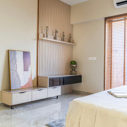 The daughter’s bedroom on the similar floor has a thoughtful combination of dark grey straited textured MCM and beige PVC fluted panels enhances the room’s visual appeal creating a soothing space. To add continuity to the room, the pvc fluted panels is interestingly carried forward from bed backdrop to the wardrobe shutters. The PU shutters on wardrobes adds a soothing contrast to the wardrobes. The olive green bed is kept with simple design that features sleek black legs and exquisite leather upholstery.