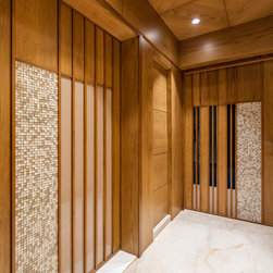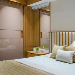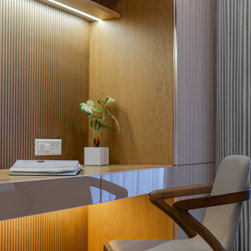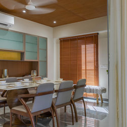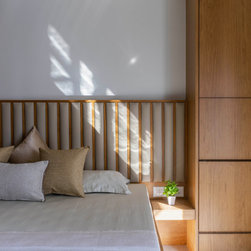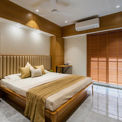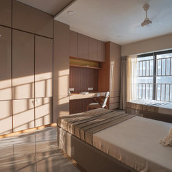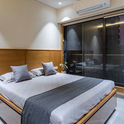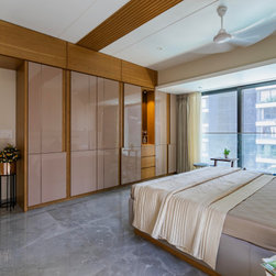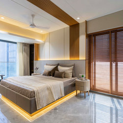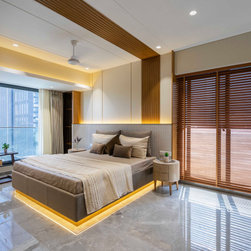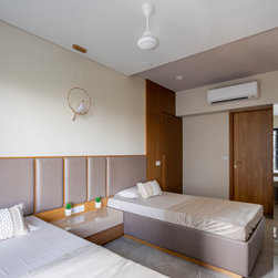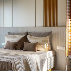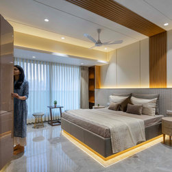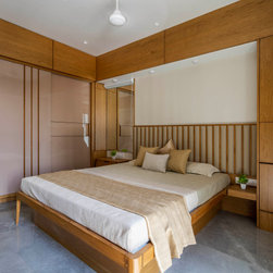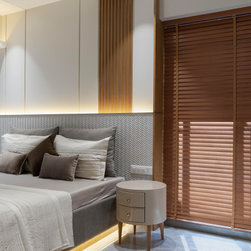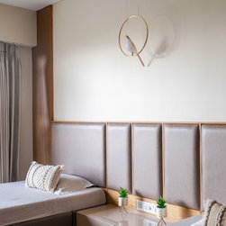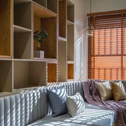 The Master bedroom with its high wooden fluted panel and white ceiling, customised wooden bed with curved backed, highlighted by a striking white Bamboo MCM Cladding lures you to come in and unwind. This bedroom becomes the point of attraction in this house as it fulfills the aspect of Simplicity combined with Minimalistic Interiors. The curved head board in the room with MCM Cladding highlights it in a unique way. The continuity of the bamboo strips from ceiling to the backdrop breaks the monotony of the room. The use of elementary colors in the room creates an aura in the space that the user love to enjoy.