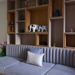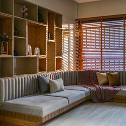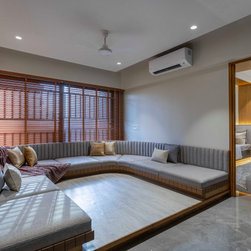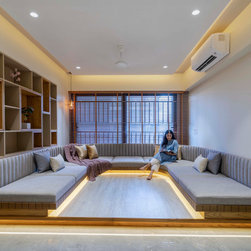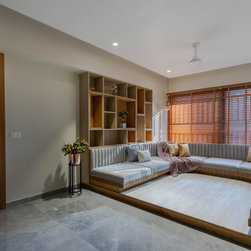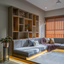 The quality that natural light adds to the Family area, creating an animated interplay of light and shadow lend a dynamic feel to this much-used space. The family room becomes a cozy place in the apartment as it is provided with Indian Low Height Sitting in a Curved Shape that reflects the charisma of the space.