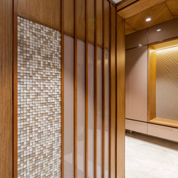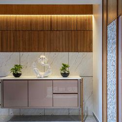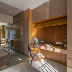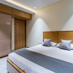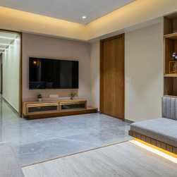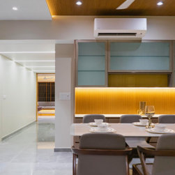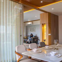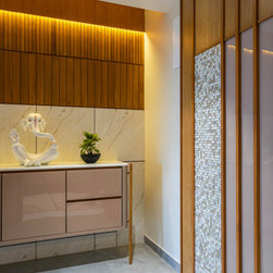 The home is a picture of serenity, with walls left in a neutral white by adding minimal texture and furniture made of veneer, with PU accents. The Door of the Guest bedroom is tactfully hidden by camouflaging it with the walls in vestibule which gives a lengthier and continues look to the vestibule.