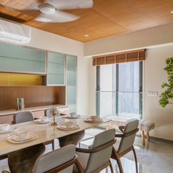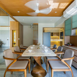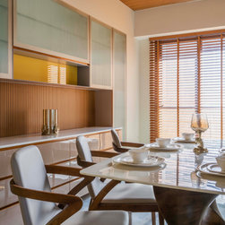 The living room has a minimalist design scheme like the rest of the house with wooden fluted panel ceiling, seamlessly running towards dining area. It is connected with the balcony to keep the user connected with nature which also fetches the natural light and air within. The relwood panels in this room, breaks the continuity of the ceiling. Whereas The MCM Cladding in the backdrop of Grey Colored Leather Sofa is highlighting element of the room.