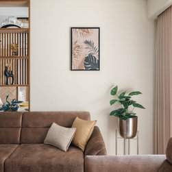 The walls here are painted in neutral shades to create a calming atmosphere. Lighting is an important aspect of a minimalist interior. Large windows in the Drawing room and Bedroom, bring natural light into the space and keeps the user connected to nature whereas simple light fixtures are used for artificial lighting. A mix of ambient, task, and accent lighting is used to create a warm and inviting atmosphere in the space.