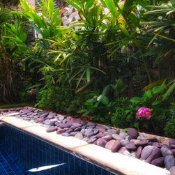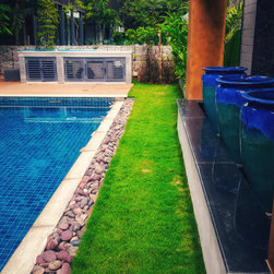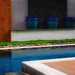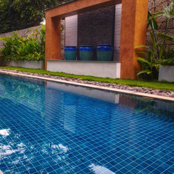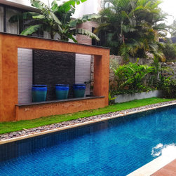 Hence we suggested construction of a Waterfall as a primary focal point instead of just plants in that area. To create multiple layers of planting and yet not allow the plants to become invasive, we used rectangular pots as borders. There are few tree species in between which should grow tall and provide a canopy in the future.