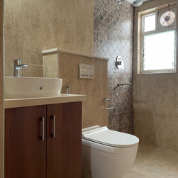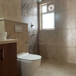 Bathroom renovation with Geberit concealed flush tank, Kohler WC and Jaquar faucets and washbasin.