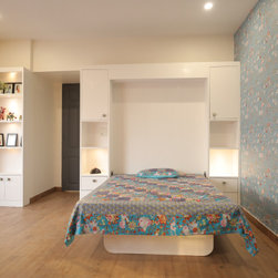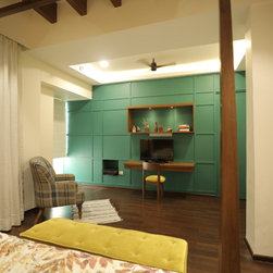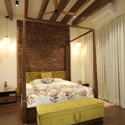 Master bed room with exposed brick wall as a backdrop to the four poster bed makes the much required highlight in the room. The emerald green partition between the room and the dresser is a sudden highlight as one turns from the brick wall.