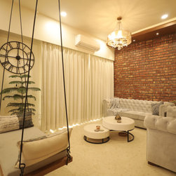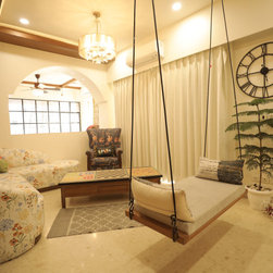 The living room is an open inviting space that connects the house from all directions. The white decor sets the much required balance to the colourful spaces. The play of prints, colours and motifs in the house provides the design element in the large open spaces.