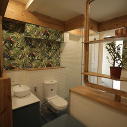 The white bathroom tiles are offset with printed floral wall paper and pine wood.