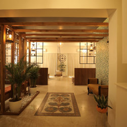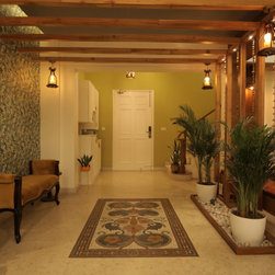 The open lobby is defined by the mosaic tile inlay and the wooden frame. The main door and the drawing room entry are aligned with the mosaic inlay to define the entrance lobby.