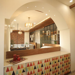 Partition between the drawing room and the dining room in form of an arch with crockery cabinet provides the much needed storage and the open partition between two spaces.