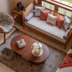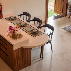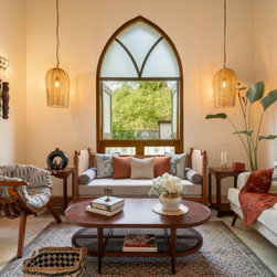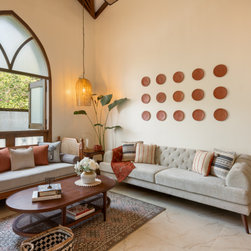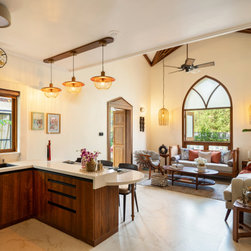 Drawing inspiration from Portuguese Goan architecture, Casa Riviera captivates with its distinctive features. The imposing presence of a tall arched Gothic window commands attention in the double-height living room, casting a mesmerizing play of light and shadow across the space. The facade, adorned in pristine white with accents of traditional blue tiles, pays homage to the region's rich heritage.