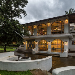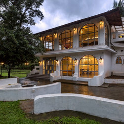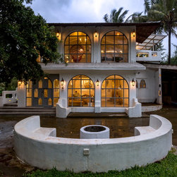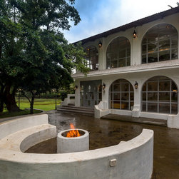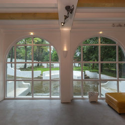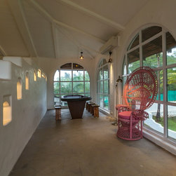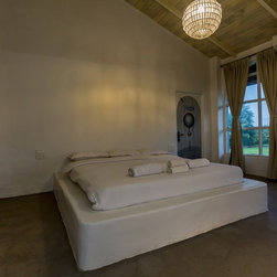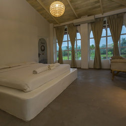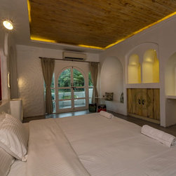This bedroom offers a beautiful overlook into the green surroundings as the interiors give warmth due to the bare stone wall and the abstract fireplace.