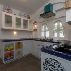 The image displays the kitchen where bold dark blue quartz countertop with beautiful niches and hand-painted shutter. The colorful shutter, the countertop, and the white decor offer a refreshing experience to a