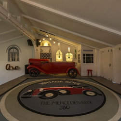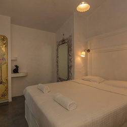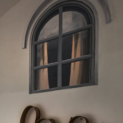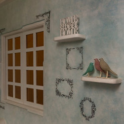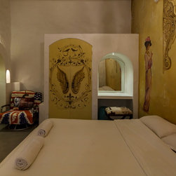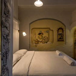 The image displays a cozy bedroom with hand-painted colonial designs on the walls and the doors.