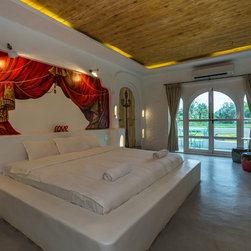 This snap showcases one of the four bedrooms with beautifully handpainted curtains on the wall to give it a royal look.