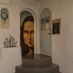 The image displays the ever beautiful Mona Lisa hand-painted on the door.