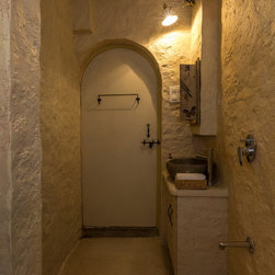 The picture offers a view of the hand-painted sky blue corridor with hand-painted arched door giving a never-ending illusion.