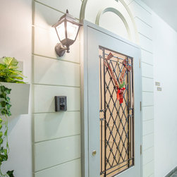 The entrance door with wrought iron grilles has dainty paneling work around it. The plasterwork suggests an arched doorway, complete with a prominent keystone at the top, which gives the arch design an authentic feel. Most country homes have detailing around the door. We added vintage outdoor lights here to give the entrance a European feel