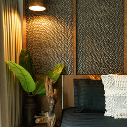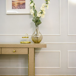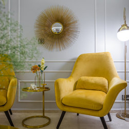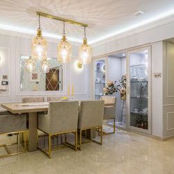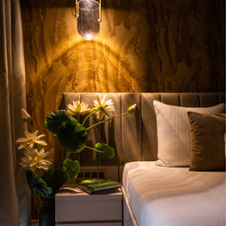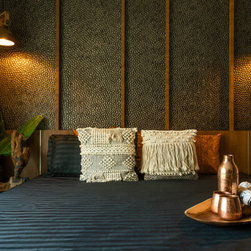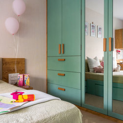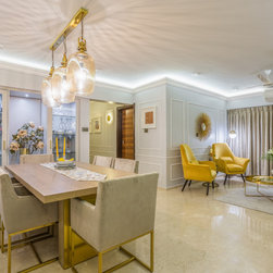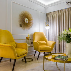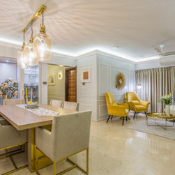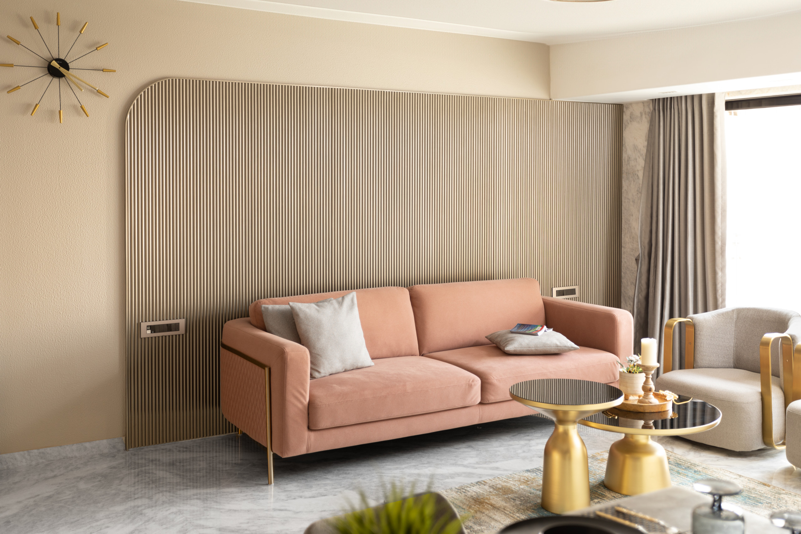 This 3 bhk home situated in the heart of the bustling Mumbai city, is designed for a young family where the common area have a luxurious cozy vibe where they can entertain guests. While the three bedrooms have a fresh, relaxing yet cozy vibe . The early morning sun kissed sand hues were used as the color palette for the living room and the master bedroom. Wall have been painted in a bluish grey tint and the pop of gold yellow lounge chairs give the bold sun kissed feel . Matt gold has been used as a key element to add a dash of luxury. The gold rush effect pours into the powder bathroom by using Matt gold basin and fittings- creating a rich exclusive feel . The kids bedroom has been given a subtle pastel candy feel. A girly vibe for the two Young’s girl we have given a baby pink wall paper to compliment the green pastel furniture. The master bedroom has the same gold sand wallpaper as the backdrop in contrast with the grayish white bedroom. Keeping it clean, cozy yet elegant. The guest bedroom has a unique back rest wall. Use of beaten black metal sheets in contrast with chocolate wooden finish creating a warm cozy vibe.
