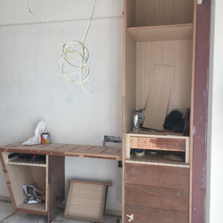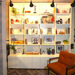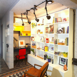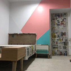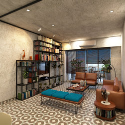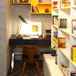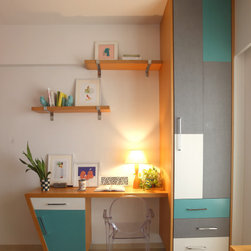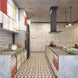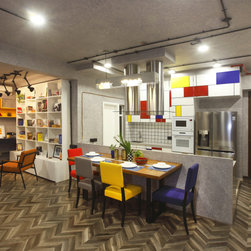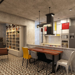 An open Mondrian theme kitchen was conceptualised. The walls and ceiling are muted in textured grey paint which forms a backdrop for the colourful furniture and accents.