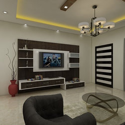 Creative T.V Unit Designed in Living with high gloss veneer combinations | Catchy False Ceiling Design with Rope Lighting | Modern Themed Chandelier |