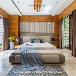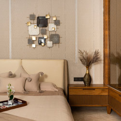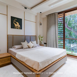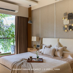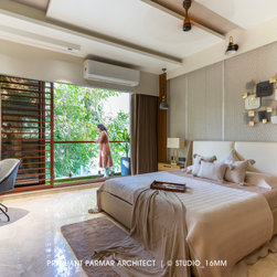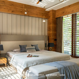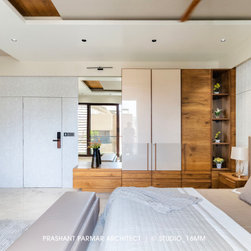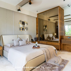 ??? ???????: All the activities here are attached to the balcony which keeps the user connected to nature. The knitted MCM cladding with vertical profile lights as a backdrop provides unique identity to this Son Bedroom. To provide a spacious look, we have used tinted mirrors on the wardrobe shutters. This bedroom is attached with large size dress and toilet.