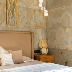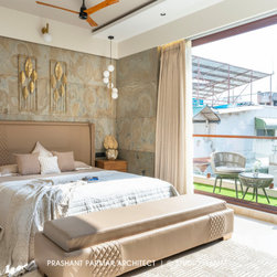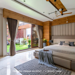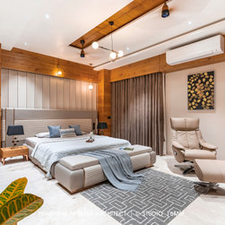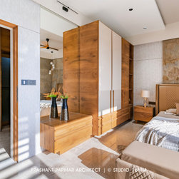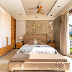 ?????? ???????: Master bedroom is significantly placed on main road side along with a large size balcony to keep the user connected with the road side activities. Soothing combination of stone veneer, and marble printed PVC fluted panels as a bed backdrop adds raw and robust look to the space. The colored PU polish with veneer on the wardrobe shutters and fabric textured wallpaper in the ceiling gels very well with the interiors. This bedroom is attached with large size dress and toilet.