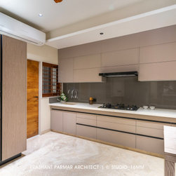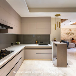 ???????: The modular kitchen is designed in a minimal way with light grey matte finished acrolam cabinets. The dark grey quartz in the dado, seizure stone platform top and grey breakfast chairs is contrasted with the overall greyish theme.