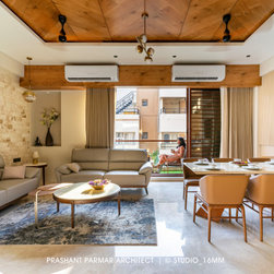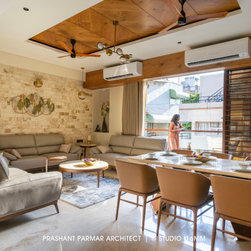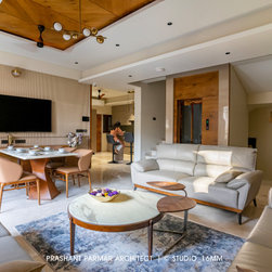 ??????? ????: The placement of the Drawing Room is done in such a way that it connects with the West side garden balcony and fetches the ample amount of natural light into the space. The beige colored stone cladding in the backdrop of Italian leather sofa highlights the space in a unique way. The wood veneer in the ceiling enhances the interiors.