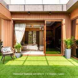 ??????’? ???????: This parent’s bedroom is minimally designed with clean details attached to a small garden balcony.