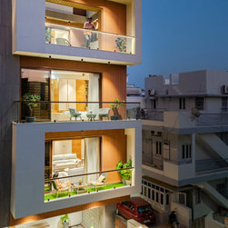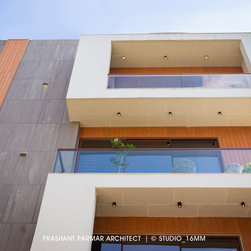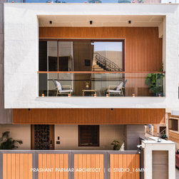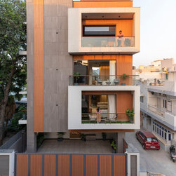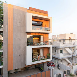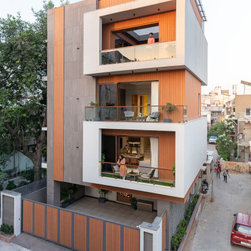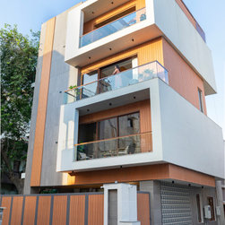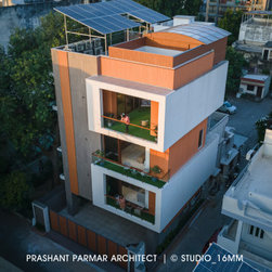 This 1400 sq ft West facing plot having site dimensions of (35’ X 40’) and built-up area of 4700 sq ft is located in the densely populated area of Paldi, Ahmedabad. The front of the Plot is attached to the Main Road on the west side and Society Road on the south side. And there is a common wall on East side, and an adjacent plot on the North side with very less margins. To give a unique identity to this house, we have created 2 cantilevered cuboids in this G+3 Structure by providing garden balconies on every levels.